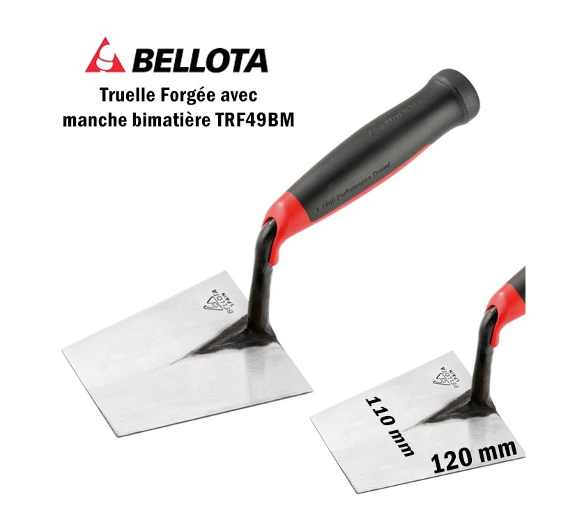Truelle professionnelle BELLOTA TRF49BM, pointe carrée, forgée en une seule pièce incassable, avec manche bi-matière ergonomique large. Idéale pour carrelage et sols.