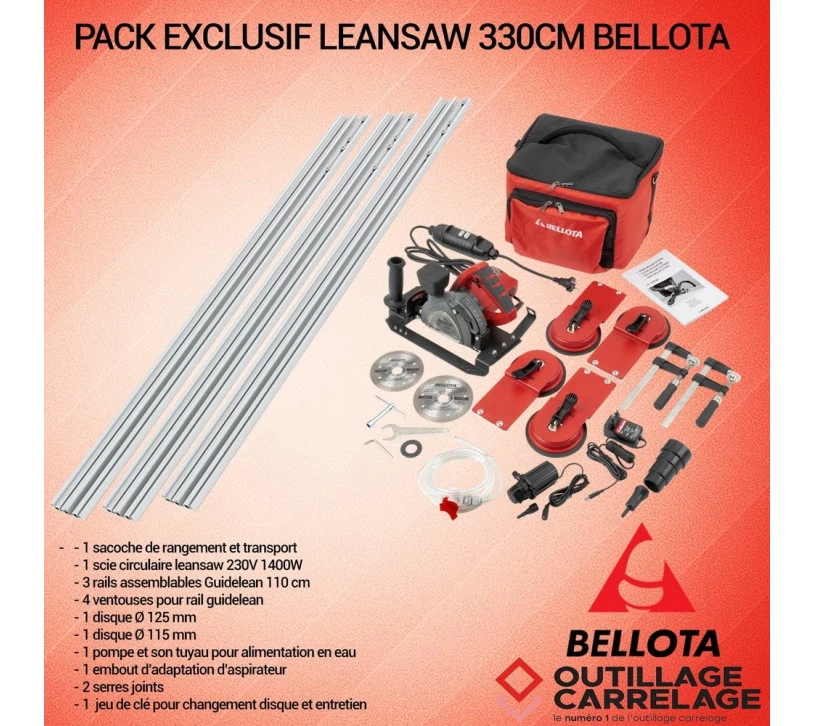 Le pack LEANSAW BELLOTA 330 cm est la solution complète pour la coupe de dalles céramiques grand format jusqu’à 3 200 mm de longueur. Composé de la scie circulaire LEANSAW 230 V – 1400 W et de 3 rails GUIDELEAN 110 cm raccordables, il garantit une coupe droite, nette et précise sur grès cérame, faïence et dalles épaisses jusqu’à 20 mm.