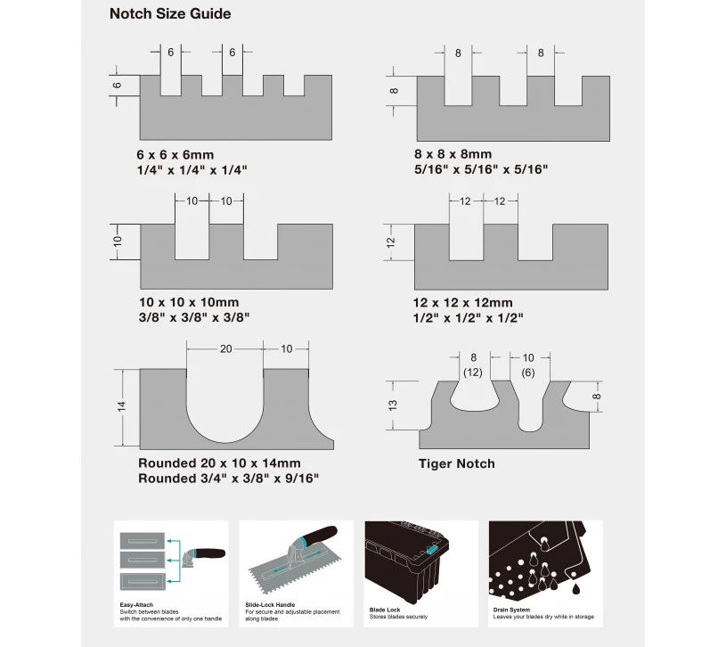 Le kit de peignes à encoches interchangeables Bihui Tools 8 pièces offre 6 options différentes de lames de peigne pour une variété de travaux de pose de carreaux, tout en fournissant un étui de rangement pratique. Vous pouvez alterner entre les lames de peigne pour les utiliser à la fois avec la main droite et la main gauche grâce à cet ensemble de peignes professionnel qui permet de gagner du temps et de l’espace de stockage.