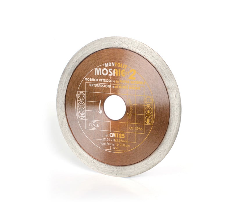 Disque diamant Montolit Ø 125 mm MOSAIC CUT CM125 pour coupes précises sur mosaïque, pâte de verre, céramique et grès cérame. Coupe ultra-fine sans éclats.