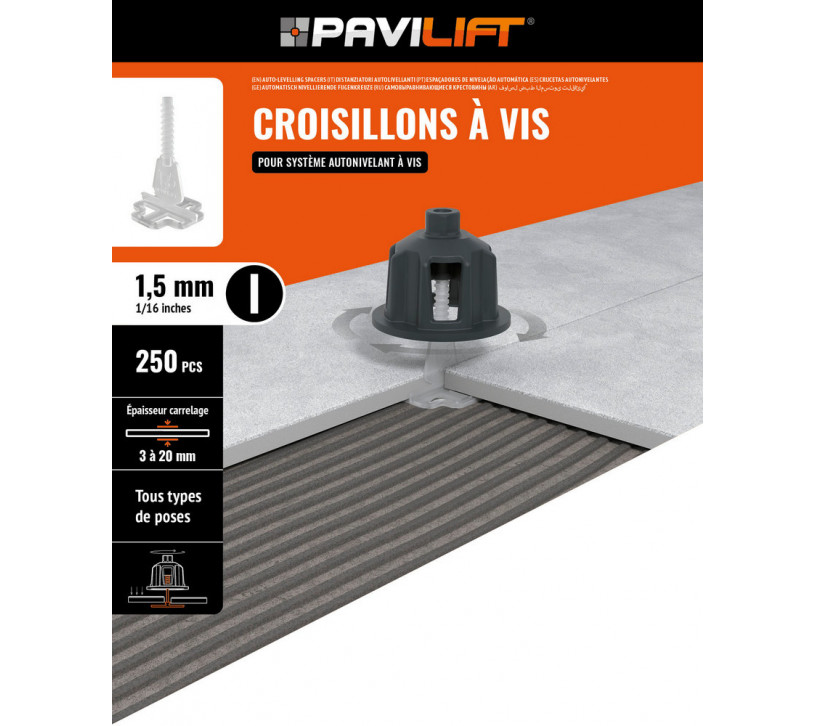 Croisillons en "I" autonivelants PAVILIFT 1,5mm ( de 3 à 20 mm ) – Lot de 250 pièces. Solution idéale pour tous types de poses, garantissant un nivellement parfait et une finition professionnelle.