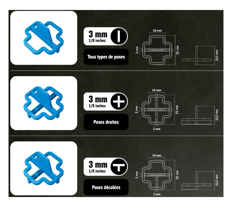 - Utilisation: Idéal pour les poses décalées et les carreaux de faible épaisseur (égaux ou inférieurs à 10 mm).