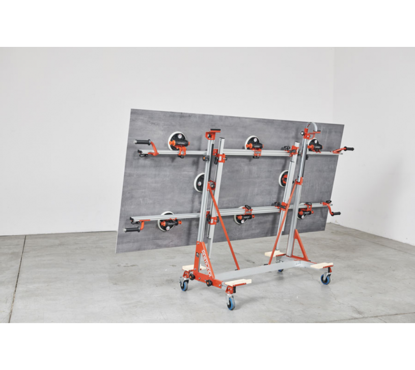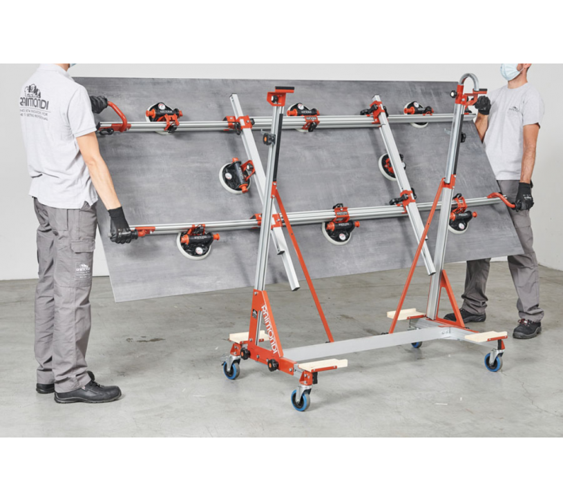 Chariot RAIMONDI CAM MkIII pour transport, stockage et encollage de dalles XXL jusqu’à 320×160 cm. Léger, démontable, charge max 250 kg.