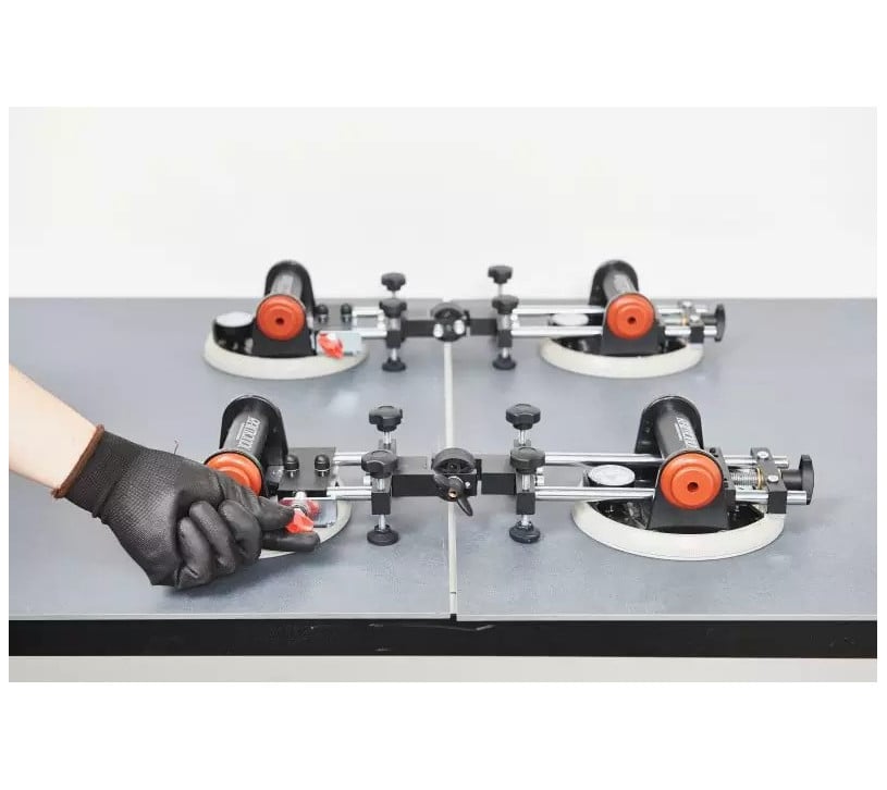 - L'alignement horizontal des 2 carreaux est réalisé à l'aide d'une molette qui règle la distance entre les deux ventouses avec une précision micrométrique.