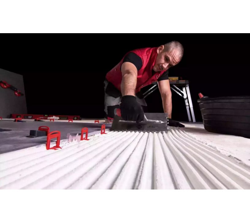 Grâce à sa conception ingénieuse, ce système évite l’apparition de sourcils entre les carreaux et réduit le nombre de corrections à apporter lors de la pose. Il stabilise les carreaux pendant la prise de l’adhésif et garantit une planéité homogène sur toute la surface.