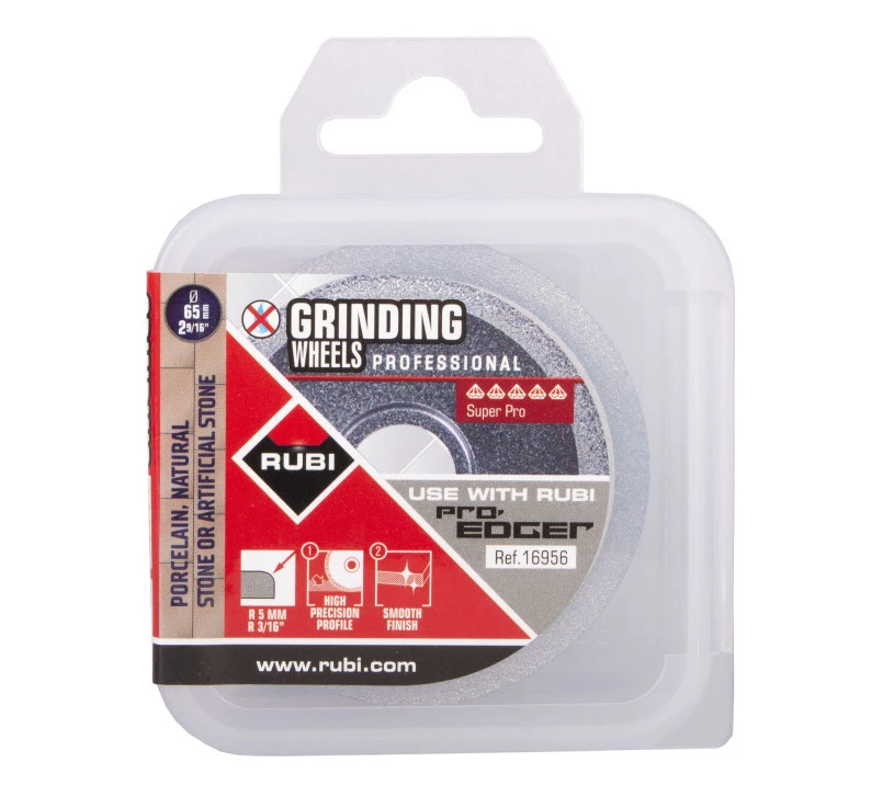 La gamme est composée de différentes meules qui permettent d'obtenir des chanfreins et profils de rayons différents, avec une excellente qualité de finition. Toutes les meules de la gamme RUBI PRO-EDGER ont été conçue avec un alliage des particules de diamants réalisé grâce à la technique de brasage sous vide, qui garantit une résistance élevée au frottement et à la température.