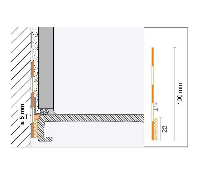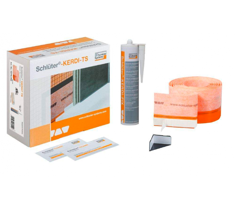 Schlüter®-KERDI-TS est un kit permettant de garantir l’étanchéité entre des éléments fixes (baignoires, receveurs de douche en acier émaillé, en acrylique ou en fonte) et le système Schlüter®-KERDI. Ce kit contient une bande d’étanchéité en polyéthylène, revêtue de non-tissé sur ses deux faces et comprenant une bande d’isolation acoustique autocollante, de la colle de montage Schlüter®-KERDI-FIX, des lingettes de nettoyage ainsi qu’un ou plusieurs angles de montage (selon le kit).