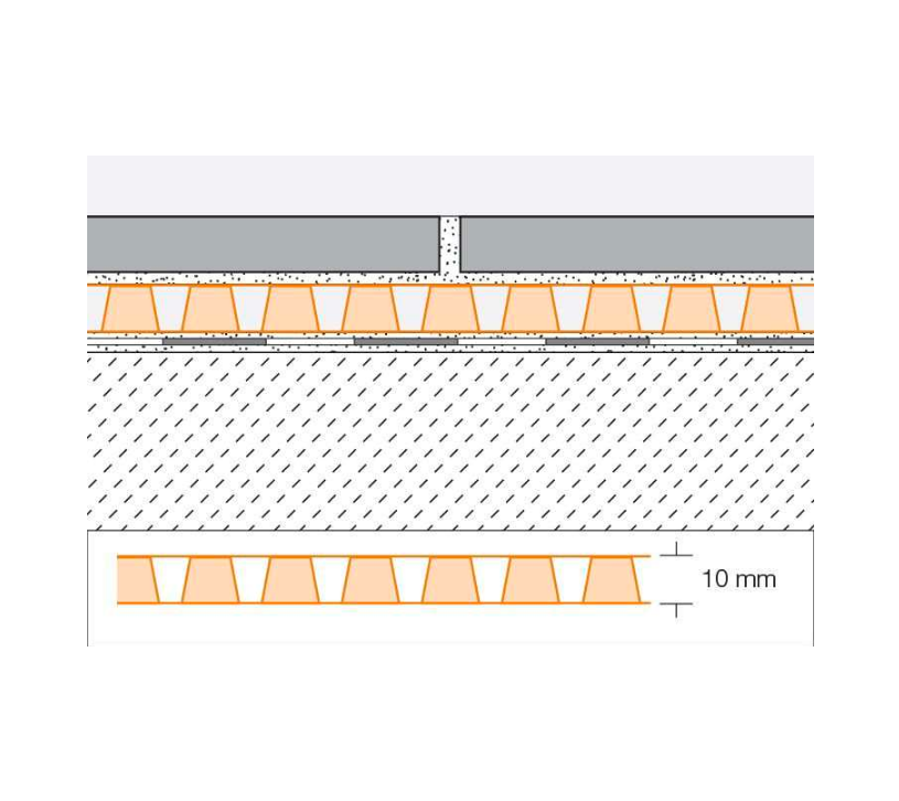 Schlüter®-DITRA-DRAIN 8 se compose d’une natte en polyéthylène avec une structure à plots en forme de cônes tronqués d’environ 10 mm de haut et d’un non-tissé en polypropylène collé sur les deux faces. Le non-tissé sur la face inférieure sert à l’ancrage dans le mortier-colle. Ce dernier doit être déposé avec une spatule crantée (de préférence de 3 x 3 mm ou 4 x 4 mm) sur la protection à l’eau ou le support béton. Schlüter®-DITRA-DRAIN 8 doit être entièrement noyée dans la colle.