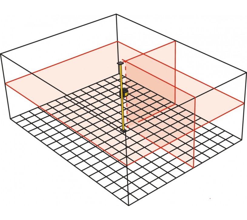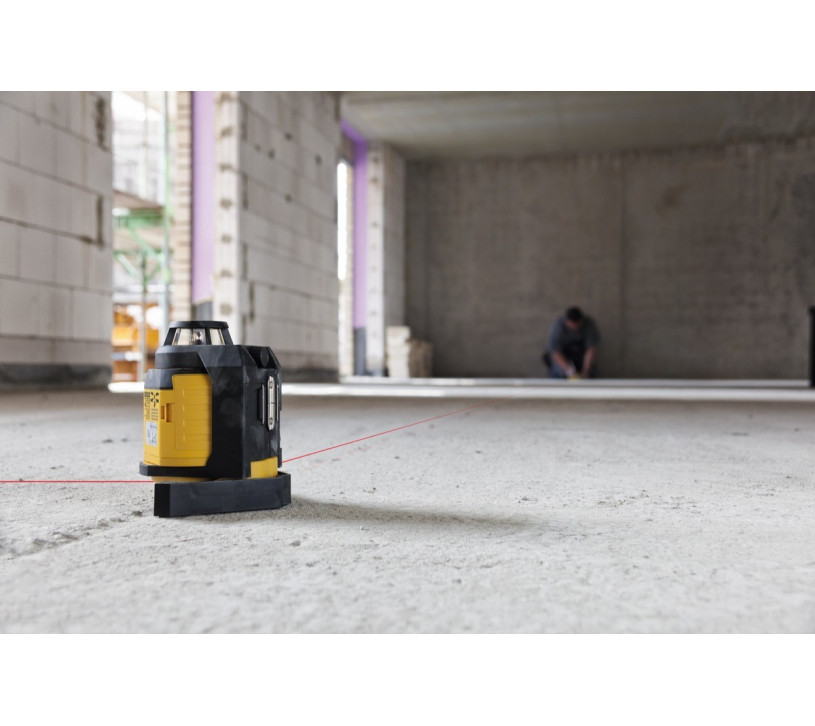 - Laser multiligne autonivelant à ligne horizontale périphérique à 360° pour le report de hauteurs, deux lignes verticales à angle de 90° et un aplomb vers le haut et le bas pour des travaux d’implantation précis.